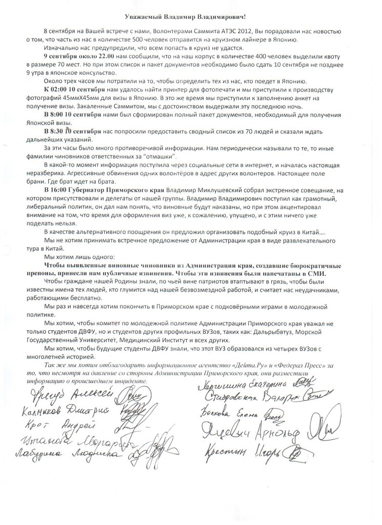Волонтеры, работавшие на во Владивостоке во время саммита, не смогли  отправиться в круиз на лайнере "Легенда морей", которое 9 сентября пообещал им  Президент России В.Путин. Волонтеры написали открытое письмо президенту, в котором рассказали, что в путешествие вместо них поехали  чиновники  из администрации Приморского края.